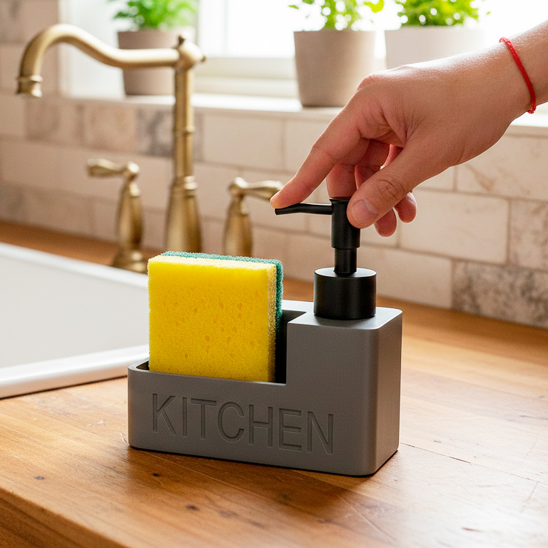 Organizador de cocina moderno con porta esponja y dispensador de jabón.