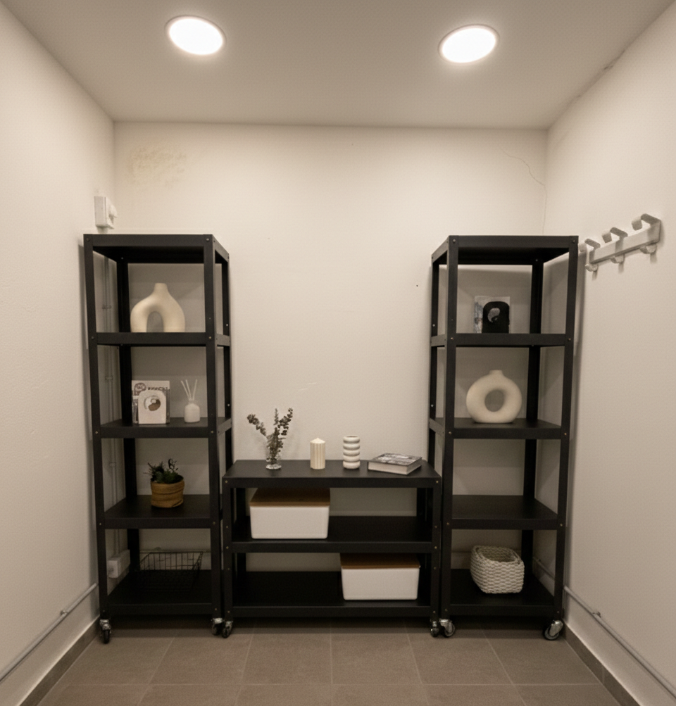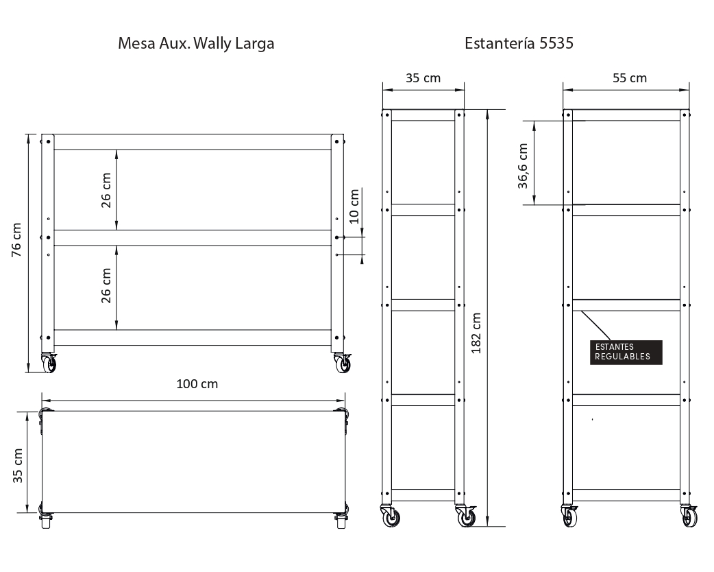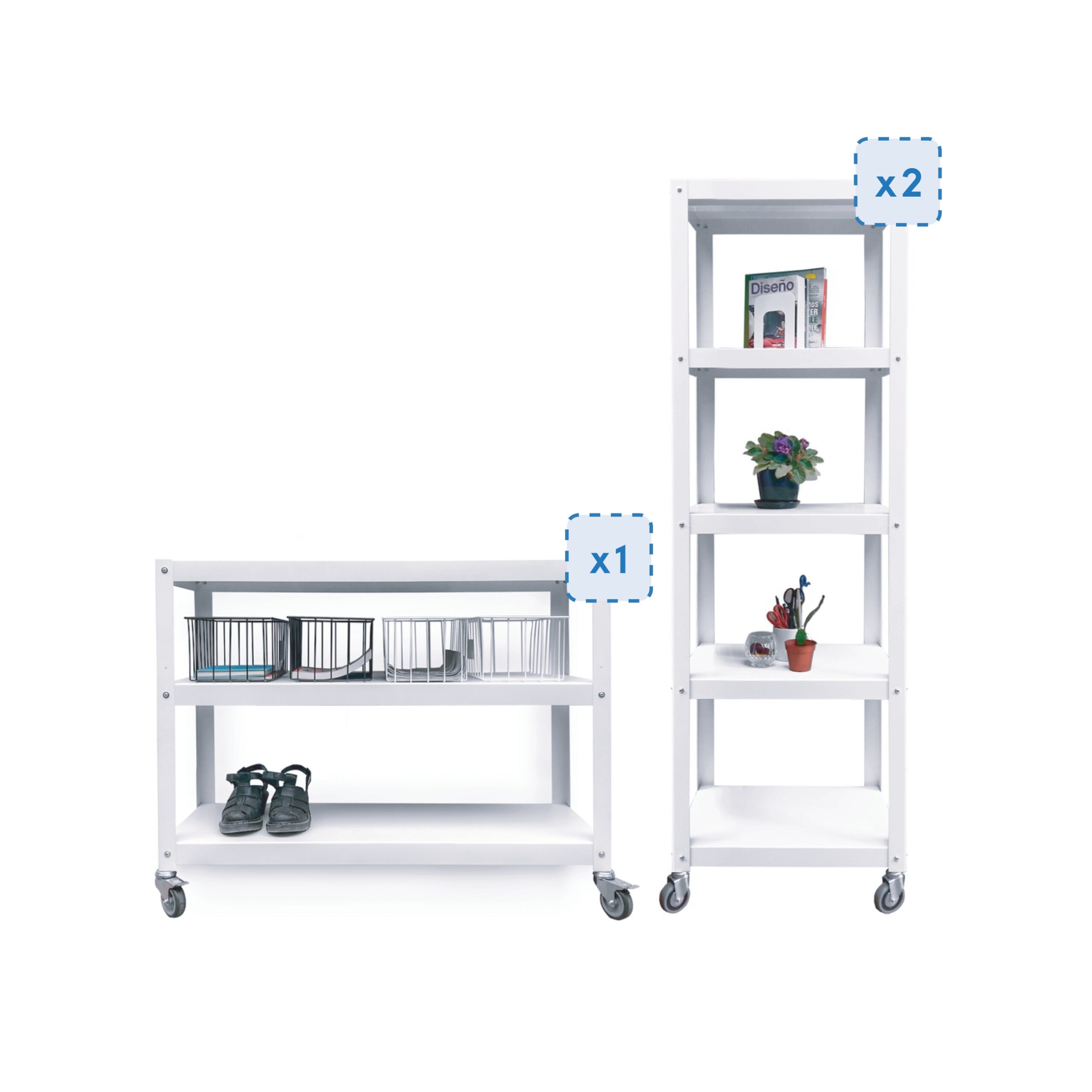 Composición funcional: Dos estanterías de 55×35 para libros, objetos deco o equipos, combinadas con una mesa ratona ideal para TV y apoyo diario.