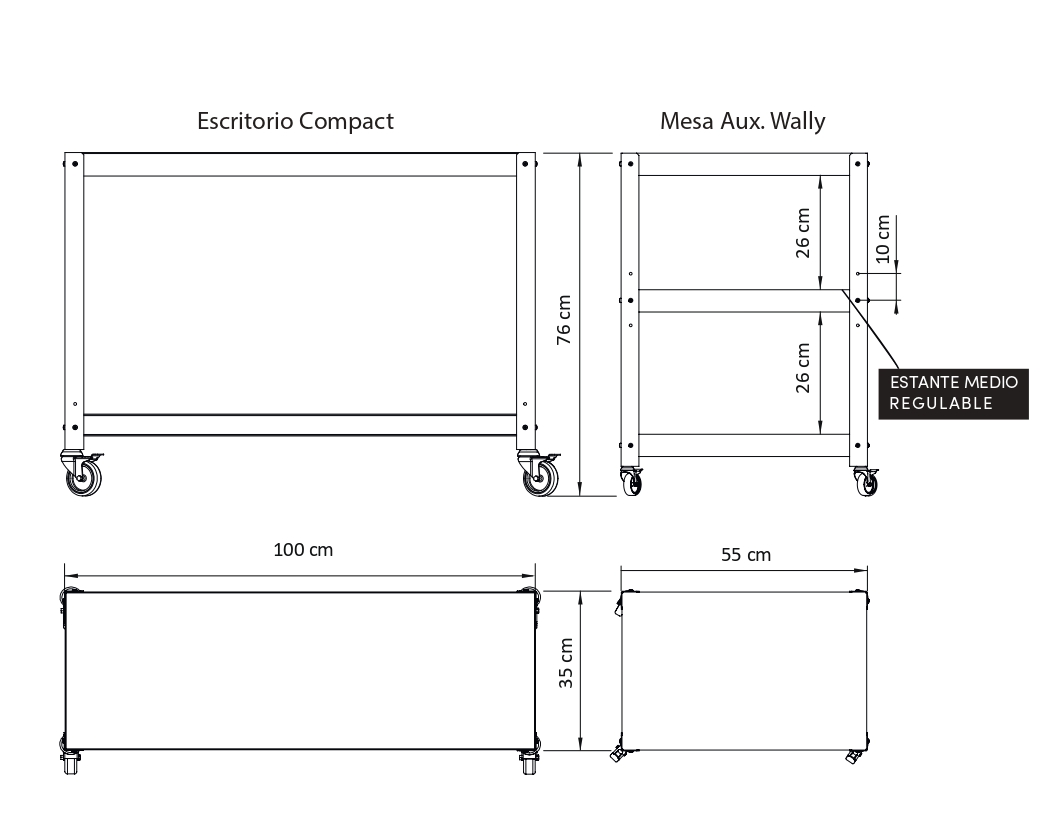 Optimiza tu estación de trabajo sin perder estilo. El Escritorio Compact 100×35 te ofrece una superficie funcional y eficiente para tus tareas diarias, ideal para espacios reducidos, departamentos o zonas de trabajo multifunción. La Mesa Auxiliar Wally 55×35 complementa el conjunto dando un apoyo extra para accesorios, equipos o materiales, manteniendo todo ordenado y al alcance de tu mano.